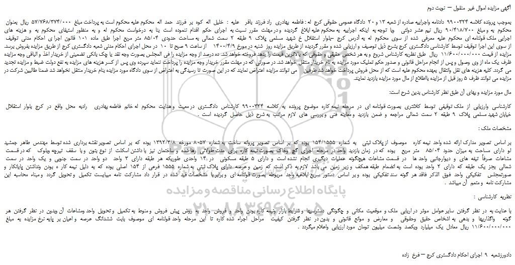 بموجب پرونده کلاسه 9900324 دادنامه واجراییه صادره از شعبه 13 و 20 دادگاه عمومی حقوقی کرج له : فاطمه بهادری راد فرزند باقر علیه : خلیل اله کوه بر فرزند حمد اله محکوم علیه محکوم است به پرداخت مبلغ 57/768/374/000 ریال بعنوان محکوم به و مبلغ 90/418/700 ریال نیم عشر دولتی وبا توجه به اینکه اجراییه به محکوم علیه ابلاغ گردیده و در مهلت مقرر نسبت به اجرای حکم اقدام ننموده است بنا به درخواست محکوم له و به منظور استیفای محکوم به و هزینه های اجرایی ملک قولنامه ای محکوم علیه معرفی شده از سوی محکوم له به آدرس کرج -بلوار استقلال خ شهید مسلمی پلاک 9 طبقه 2 سمت شمالی به مساحت حدودی 85/04 متر مربع اجرا طبق ماده 101 قانون اجرا ی احکام مدنی توقیف از سوی این اجرا توقیف توسط کارشناسی دادگستری کرج بشرح ذیل توصیف و ارزیابی شده و مقرر گردیده از طریق مزایده روز شنبه در مورخ 1400/4/9 از ساعت 9 صبح تا 10 در محل اجرای احکام مدنی شعبه دادگستری کرج از طریق مزایده بفروش برسد. مزایده از قیمت 11/600/000/000 ریال طبق نظریه کارشناس شروع و به هر شخص حقیقی و حقوقی که بالاترین قیمت را بدهد فروخته خواهد شد. ده درصد از وجه مزایده را فی المجلس بصورت وجه نقد یا چک بانکی تضمینی از خریدار اخذ و الباقی وجه مزایده ظرف یک ماه از وی وصول و پس از انجام مراحل قانونی و صدور حکم تملیک مورد مزایده به نام خریدار منتقل خواهد شد. در صورتی که در مهلت مقرر خریدار وجه مزایده را پرداخت ننماید سپرده وی پس از کسر هزینه های مزایده به نفع دولت ضبط و مزایده تجدید می گردد. کلیه هزینه های نقل وانتقال بعهده محکوم علیه است که از محل فروش پرداخت خواهد شد طرفین می توانند مزایده اعتراض نمایند که در این صورت تا رسیدگی به اعتراض از سوی دادگاه مورد مزایده بنام خریدار منتقل نخواهد شد ضمنا طالبین شرکت در مزایده می توانند ظرف 5 روز قبل از مزایده بااطلاع از مال مورد مزایده بازدید نمایند.