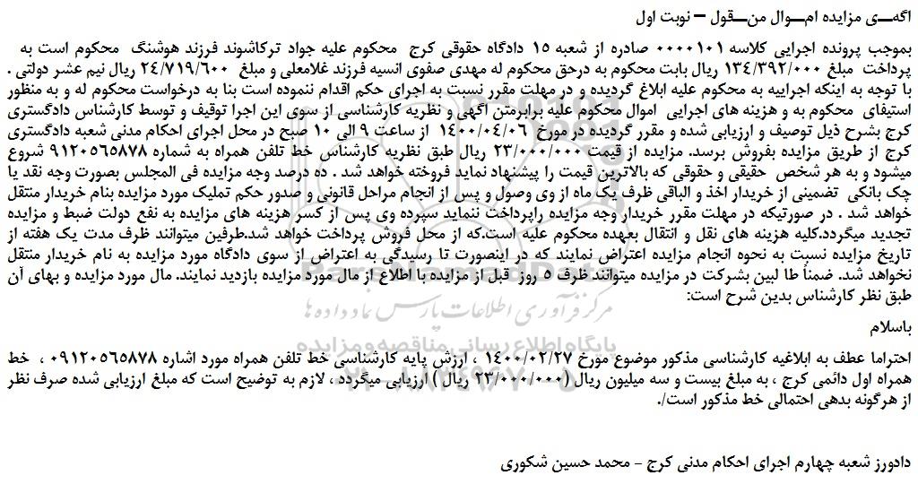 بموجب پرونده اجرایی کلاسه 0000101 صادره از شعبه 15 دادگاه حقوقی کرج  محکوم علیه جواد ترکاشوند فرزند هوشنگ  محکوم است به پرداخت  مبلغ 134/392/000 ریال بابت محکوم به درحق محکوم له مهدی صفوی انسیه فرزند غلامعلی و مبلغ  24/719/600 ریال نیم عشر دولتی . با توجه به اینکه اجراییه به محکوم علیه ابلاغ گردیده و در مهلت مقرر نسبت به اجرای حکم اقدام ننموده است بنا به درخواست محکوم له و به منظور استیفای  محکوم به و هزینه های اجرایی  اموال محکوم علیه برابرمتن اگهی و نظریه کارشناسی از سوی این اجرا توقیف و توسط کارشناس دادگستری کرج بشرح ذیل توصیف و ارزیابی شده و مقرر گردیده در مورخ  1400/04/06  از ساعت 9 الی 10 صبح در محل اجرای احکام مدنی شعبه دادگستری کرج از طریق مزایده بفروش برسد. مزایده از قیمت 23/000/000 ریال طبق نظریه کارشناس خط تلفن همراه به شماره 9120565878 شروع میشود و به هر شخص  حقیقی و حقوقی که بالاترین قیمت را پیشنهاد نماید فروخته خواهد شد . ده درصد وجه مزایده فی المجلس بصورت وجه نقد یا چک بانکی  تضمینی از خریدار اخذ و الباقی ظرف یک ماه از وی وصول و پس از انجام مراحل قانونی و صدور حکم تملیک مورد مزایده بنام خریدار منتقل خواهد شد . در صورتیکه در مهلت مقرر خریدار وجه مزایده راپرداخت ننماید سپرده وی پس از کسر هزینه های مزایده به نفع دولت ضبط و مزایده تجدید میگردد.کلیه هزینه های نقل و انتقال بعهده محکوم علیه است.که از محل فروش پرداخت خواهد شد.طرفین میتوانند ظرف مدت یک هفته از تاریخ مزایده نسبت به نحوه انجام مزایده اعتراض نمایند که در اینصورت تا رسیدگی به اعتراض از سوی دادگاه مورد مزایده به نام خریدار منتقل نخواهد شد. ضمناً طا لبین بشرکت در مزایده میتوانند ظرف 5 روز  قبل از مزایده با اطلاع از مال مورد مزایده بازدید نمایند. مال مورد مزایده و بهای آن طبق نظر کارشناس بدین شرح است: