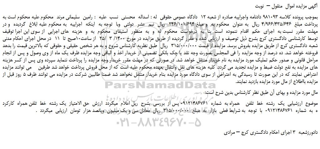 بموجب پرونده کلاسه 981093 دادنامه واجراییه صادره از شعبه 12 دادگاه عمومی حقوقی له : اسداله محسنی نسب علیه : رامین سلیمانی مرند محکوم علیه محکوم است به پرداخت مبلغ 4/966/435/646 ریال به عنوان محکوم به و مبلغ 246/101/694 ریال نیم عشر دولتی وبا توجه به اینکه اجراییه به محکوم علیه ابلاغ گردیده و در مهلت مقرر نسبت به اجرای حکم اقدام ننموده است بنا به درخواست محکوم له و به منظور استیفای محکوم به و هزینه های اجرایی از سوی این اجرا توقیف توسط کارشناسی دادگستری کرج بشرح ذیل توصیف و ارزیابی شده و مقرر گردیده از طریق مزایده در مورخ 1400/ 3 /25 از ساعت10صبح تا 11 در محل اجرای احکام مدنی شعبه دادگستری کرج از طریق مزایده بفروش برسد. مزایده از قیمت 315/000/000 ریال طبق نظریه کارشناس شروع و به هر شخص حقیقی و حقوقی که بالاترین قیمت را بدهد فروخته خواهد شد. ده درصد از وجه مزایده را فی المجلس بصورت وجه نقد یا چک بانکی تضمینی از خریدار اخذ و الباقی وجه مزایده ظرف یک ماه از وی وصول و پس از انجام مراحل قانونی و صدور حکم تملیک مورد مزایده به نام خریدار منتقل خواهد شد. در صورتی که در مهلت مقرر خریدار وجه مزایده را پرداخت ننماید سپرده وی پس از کسر هزینه های مزایده به نفع دولت ضبط و مزایده تجدید می گردد. کلیه هزینه های نقل وانتقال بعهده محکوم علیه است که از محل فروش پرداخت خواهد شد طرفین می توانند مزایده اعتراض نمایند که در این صورت تا رسیدگی به اعتراض از سوی دادگاه مورد مزایده بنام خریدار منتقل نخواهد شد ضمنا طالبین شرکت در مزایده می توانند ظرف 5 روز قبل از مزایده بااطلاع از مال مورد مزایده بازدید نمایند.