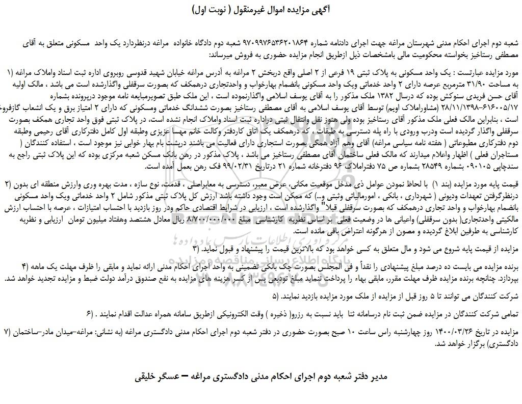شعبه دوم اجرای احکام مدنی شهرستان مراغه جهت اجرای دادنامه شماره 9709976536201864 شعبه دوم دادگاه خانواده  مراغه درنظردارد یک واحد  مسکونی متعلق به آقای مصطفی رستاخیز بخواسته محکومیت مالی بامشخصات ذیل ازطریق انجام مزایده حضوری به فروش میرساند:
