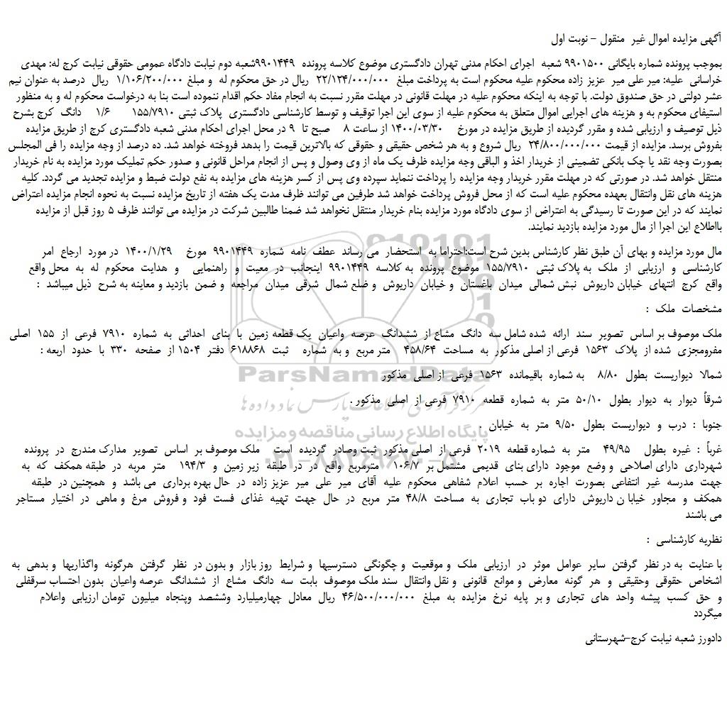 بموجب پرونده شماره بایگانی 9901500 شعبه اجرای احکام مدنی تهران دادگستری موضوع کلاسه پرونده 9901449شعبه دوم نیابت دادگاه عمومی حقوقی نیابت کرج له: مهدی خراسانی علیه: میر علی میر عزیز زاده محکوم علیه محکوم است به پرداخت مبلغ 22/124/000/000 ریال در حق محکوم له و مبلغ 1/106/200/000 ریال درصد به عنوان نیم عشر دولتی در حق صندوق دولت. با توجه به اینکه محکوم علیه در مهلت قانونی در مهلت مقرر نسبت به انجام مفاد حکم اقدام ننموده است بنا به درخواست محکوم له و به منظور استیفای محکوم به و هزینه های اجرایی اموال متعلق به محکوم علیه از سوی این اجرا توقیف و توسط کارشناسی دادگستری پلاک ثبتی 155/7910 1/6 دانگ کرج بشرح ذیل توصیف و ارزیابی شده و مقرر گردیده از طریق مزایده در مورخ 1400/03/30 از ساعت 8 صبح تا 9 در محل اجرای احکام مدنی شعبه دادگستری کرج از طریق مزایده بفروش برسد. مزایده از قیمت 24/800/000/000 ریال شروع و به هر شخص حقیقی و حقوقی که بالاترین قیمت را بدهد فروخته خواهد شد. ده درصد از وجه مزایده را فی المجلس بصورت وجه نقد یا چک بانکی تضمینی از خریدار اخذ و الباقی وجه مزایده ظرف یک ماه از وی وصول و پس از انجام مراحل قانونی و صدور حکم تملیک مورد مزایده به نام خریدار منتقل خواهد شد. در صورتی که در مهلت مقرر خریدار وجه مزایده را پرداخت ننماید سپرده وی پس از کسر هزینه های مزایده به نفع دولت ضبط و مزایده تجدید می گردد. کلیه هزینه های نقل وانتقال بعهده محکوم علیه است که از محل فروش پرداخت خواهد شد طرفین می توانند ظرف مدت یک هفته از تاریخ مزایده نسبت به نحوه انجام مزایده اعتراض نمایند که در این صورت تا رسیدگی به اعتراض از سوی دادگاه مورد مزایده بنام خریدار منتقل نخواهد شد ضمنا طالبین شرکت در مزایده می توانند ظرف 5 روز قبل از مزایده بااطلاع این اجرا از مال مورد مزایده بازدید نمایند.