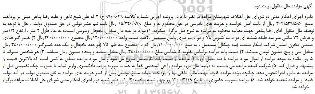 دایره اجرای احکام مدنی دو شورای حل اختلاف شهرستان مراغه در نظر دارد در پرونده اجرایی بشماره کلاسه 9900649 ج/ 2 له علی شیخ تاجی و علیه رضا پناهی مبنی بر پرداخت مبلغ 304/539/596 ریال از بابت اصل خواسته و هزینه های دادرسی در حق محکوم له و مبلغ 15/226/979 ریال بابت نیم عشر دولتی در حق صندوق دولت ، حال با توجه به توقیف مال منقول آقای رضا پناهی جهت مطالبه محکوم به مزایده به شرح ذیل برگزار میگردد. 1) مورد مزایده: مال منقول: یخچال ویترینی ایستاده به بعاد طول 2 متر ، ارتفاع 1/2متر و عرض 72 سانتی متر سه طبقه شیشه ای دو درب کشویی بالا و دو درب فلزی پایین مستعمل ،2عدد قیمت واحد 120/000/000ریال مجموع 240/000/000ریال 2) خمیر گیر قنادی صنعتی مخزن استیل شرکت ابتکار صنعت (سه چنگال) مستعمل ، به مبلغ 110/000/000ریال که در مجموع سه قلم کالا (دو عدد یخچال و یک عدد خمیرگیر 350/000/000 ریال معادل سی و پنج میلیون تومان میباشد. 2) قیمت پایه مزایده براساس نظریه کارشناسی مبلغ 350/000/000 ریال معادل سیصد و پنجاه میلیون ریال میباشد. 3) هر شخصی میتواند تا 5 روز مانده به موعد مزایده از اموال مورد مزایده بازدید بعمل آورد. 4) مزایده از قیمت پایه کارشناسی شروع می شود و مال مورد مزایده متعلق به کسی است که بالاترین قیمت را پیشنهاد و قبول کند. 5) شرکت کننده مزایده می بایست ده درصد مال مورد مزایده را فی المجلس نقدا به حساب سپرده موقت دادگستری واریز نماید یا بصورت چک تضمینی قبل از مزایده به مامور اجرا تحویل دهد. چنانچه برنده مزایده ظرف مهلت مقرر مابقی بها را پرداخت ننماید مبلبغ تودیعی پس از کسر هزینه های مزایده به نفع صندوق دولت در آمد دولت ضبط و مزایده تجدید خواهد شد. 6) مزایده بصورت حضوری در تاریخ 1400/3/19روز چهار شنبه ساعت10/30در دفتر شعبه دوم اجرای احکام مدنی شورای حل اختلاف مراغه برگزار خواهد شد.