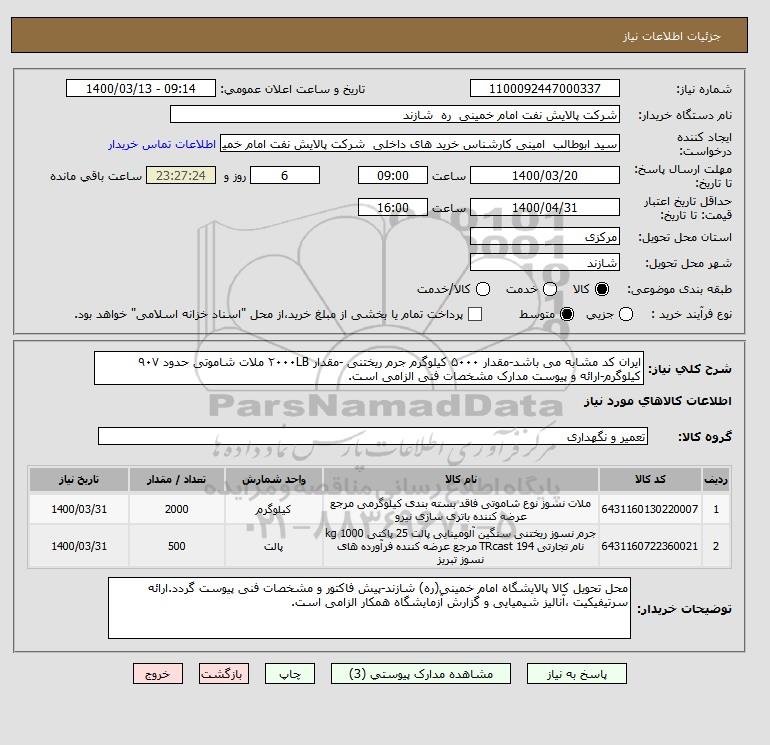 استعلام ایران کد مشابه می باشد-مقدار ۵۰۰۰ کیلوگرم جرم ریختنی -مقدار ۲۰۰۰LB ملات شاموتی حدود ۹۰۷ کیلوگرم-ارائه و پیوست مدارک مشخصات فنی الزامی است., استعلام ایران کد مشابه می باشد-مقدار ۵۰۰۰ کیلوگرم جرم ریختنی -مقدار ۲۰۰۰LB ملات شاموتی حدود ۹۰۷ کیلوگرم-ارائه و پیوست مدارک مشخصات فنی الزامی است.