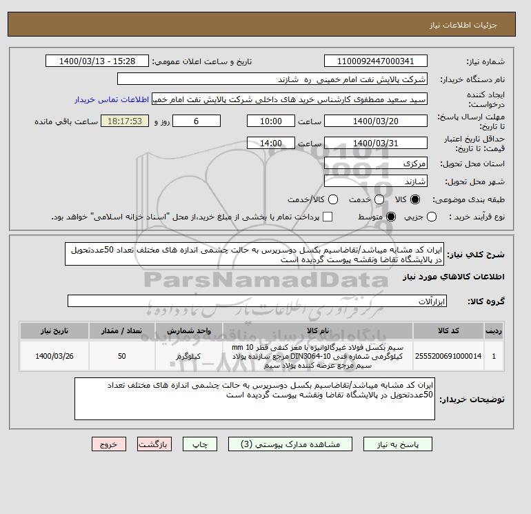 شرح کلی نیاز: ایران کد مشابه میباشد/تقاضاسیم بکسل دوسرپرس به حالت چشمی اندازه های مختلف تعداد 50عددتحویل در پالایشگاه تقاضا ونقشه پیوست گردیده است