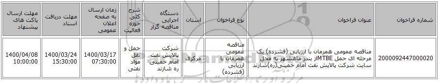 مناقصه، مناقصه عمومی همزمان با ارزیابی (فشرده) یک مرحله ای حمل MTBEاز بندر ماهشهر به محل سایت شرکت پالایش نفت امام خمینی(ره)شازند, مناقصه عمومی همزمان با ارزیابی (فشرده) یک مرحله ای حمل MTBEاز بندر ماهشهر به محل سایت شرکت پالایش نفت امام خمینی(ره)شازند