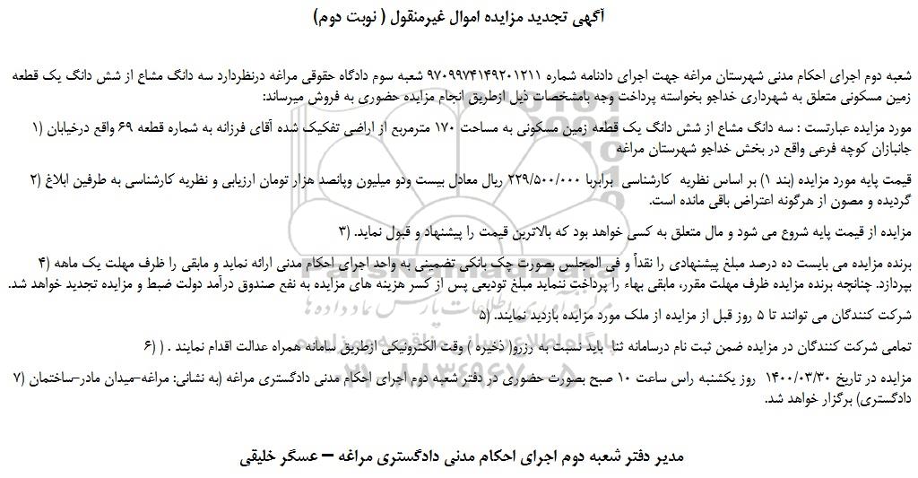 شعبه دوم اجرای احکام مدنی شهرستان مراغه جهت اجرای دادنامه شماره 9709974149201211 شعبه سوم دادگاه حقوقی مراغه درنظردارد سه دانگ مشاع از شش دانگ یک قطعه زمین مسکونی متعلق به شهرداری خداجو بخواسته پرداخت وجه بامشخصات ذیل ازطریق انجام مزایده حضوری به فروش میرساند: