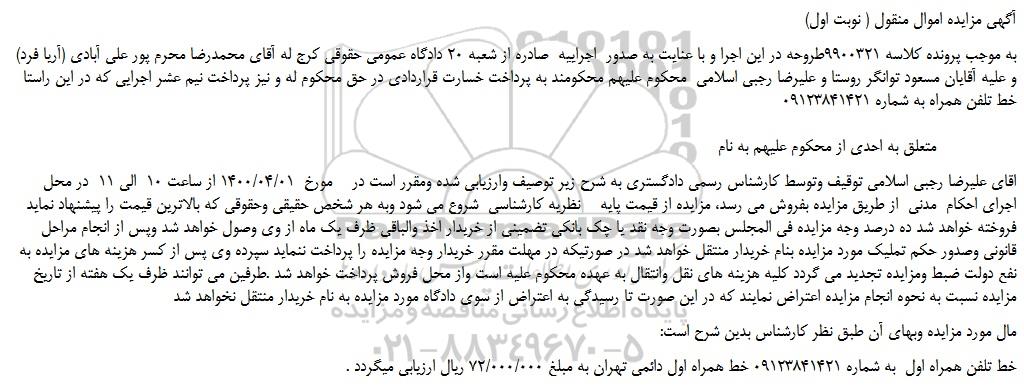اقای علیرضا رجبی اسلامی توقیف وتوسط کارشناس رسمی دادگستری به شرح زیر توصیف وارزیابی شده ومقرر است در    مورخ  1400/04/01 از ساعت 10  الی 11  در محل اجرای احکام  مدنی  از طریق مزایده بفروش می رسد، مزایده از قیمت پایه    نظریه کارشناسی  شروع می شود وبه هر شخص حقیقی وحقوقی که بالاترین قیمت را پیشنهاد نماید فروخته خواهد شد ده درصد وجه مزایده فی المجلس بصورت وجه نقد یا چک بانکی تضمینی از خریدار اخذ والباقی ظرف یک ماه از وی وصول خواهد شد وپس از انجام مراحل قانونی وصدور حکم تملیک مورد مزایده بنام خریدار منتقل خواهد شد در صورتیکه در مهلت مقرر خریدار وجه مزایده را پرداخت ننماید سپرده وی پس از کسر هزینه های مزایده به نفع دولت ضبط ومزایده تجدید می گردد کلیه هزینه های نقل وانتقال به عهده محکوم علیه است واز محل فروش پرداخت خواهد شد .طرفین می توانند ظرف یک هفته از تاریخ مزایده نسبت به نحوه انجام مزایده اعتراض نمایند که در این صورت تا رسیدگی به اعتراض از سوی دادگاه مورد مزایده به نام خریدار منتقل نخواهد شد