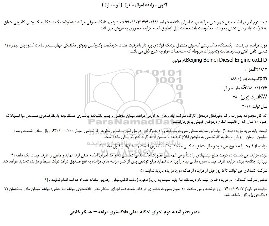 شعبه دوم اجرای احکام مدنی شهرستان مراغه جهت اجرای دادنامه شماره 9909974149401481 شعبه پنجم دادگاه حقوقی مراغه درنظردارد یک دستگاه میکسربتنی کامیونی متعلق به شرکت آباد راهان دشتی بخواسته محکومیت بامشخصات ذیل ازطریق انجام مزایده حضوری به فروش میرساند:
