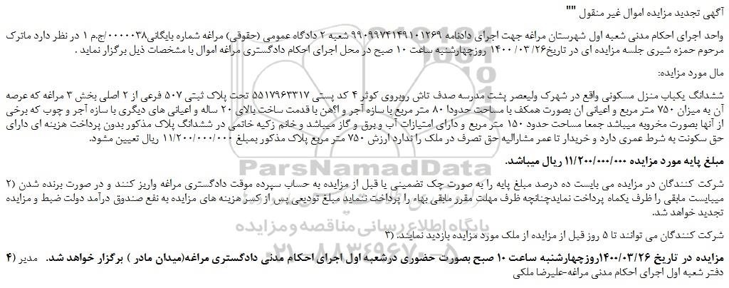 واحد اجرای احکام مدنی شعبه اول شهرستان مراغه جهت اجرای دادنامه 9909974149101269 شعبه 2 دادگاه عمومی (حقوقی) مراغه شماره بایگانی0000038/ج.م 1 در نظر دارد ماترک مرحوم حمزه شیری جلسه مزایده ای در تاریخ26/ 03/ 1400 روزچهارشنبه ساعت 10 صبح در محل اجرای احکام دادگستری مراغه اموال با مشخصات ذیل برگزار نماید .