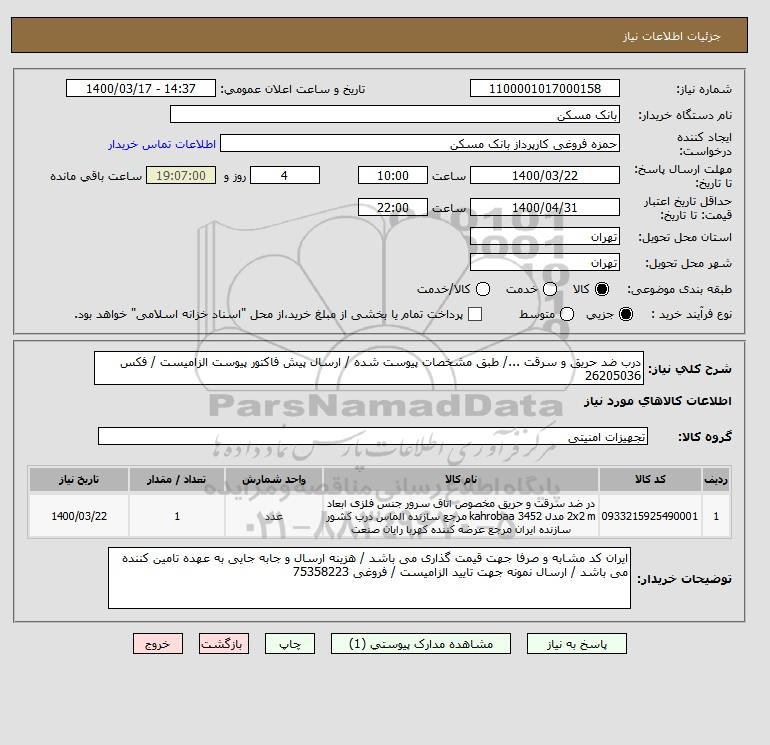 شرح کلی نیاز: درب ضد حریق و سرقت .../ طبق مشخصات پیوست شده / ارسال پیش فاکتور پیوست الزامیست / فکس 26205036