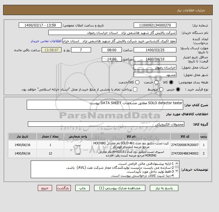 شرح کلی نیاز: SOLO detector tester مطابق مشخصات DATA SHEET پیوست