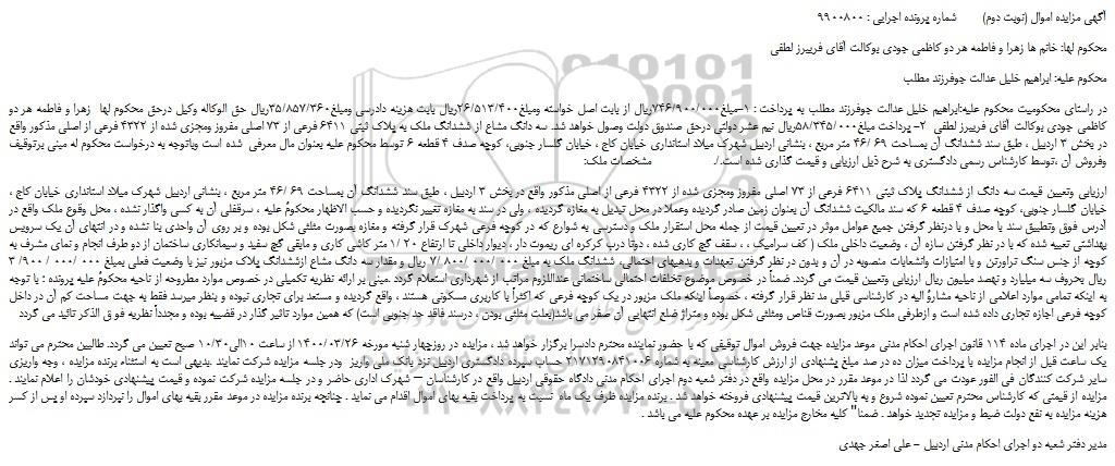 در راستای محکومیت محکوم علیه:ابراهیم خلیل عدالت جوفرزند مطلب به پرداخت : 1-مبلغ746/900/000ریال از بابت اصل خواسته ومبلغ26/513/400ریال بابت هزینه دادرسی ومبلغ35/857/360ریال حق الوکاله وکیل درحق محکوم لها زهرا و فاطمه هر دو کاظمی جودی بوکالت آقای فریبرز لطفی 2- پرداخت مبلغ58/345/000ریال نیم عشر دولتی درحق صندوق دولت وصول خواهد شد. سه دانگ مشاع از ششدانگ ملک به پلاک ثبتی 6411 فرعی از 73 اصلی مفروز ومجزی شده از 4322 فرعی از اصلی مذکور واقع در بخش 3 اردبیل ، طبق سند ششدانگ آن بمساحت 69 /46 متر مربع ، بنشانی اردبیل شهرک میلاد استانداری خیابان کاج ، خیابان گلسار جنوبی، کوچه صدف 4 قطعه 6 توسط محکوم علیه بعنوان مال معرفی شده است وباتوجه به درخواست محکوم له مبنی برتوقیف وفروش آن ،توسط کارشناس رسمی دادگستری به شرح ذیل ارزیابی و قیمت گذاری شده است./. مشخصات ملک:
