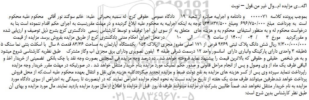 بموجب پرونده کلاسه 0000071 و دادنامه و اجراییه صادره از شعبه 19 دادگاه عمومی حقوقی کرج له سمیه بحیرائی علیه: خانم سوگند نور آقائی محکوم علیه محکوم است به چرداخت مبلغ 696/750/000 ومبلغ 34/837/500با توجه به اینکه اجراییه به محکوم علیه ابلاغ گردیده و در مهلت مقررنسبت به اجرای حکم اقدام ننموده است بنا به درخواست محکوم له و به منظور استیفای محکوم به و هزینه های متعلق به از سوی این اجرا توقیف و توسط کارشناس رسمی دادگستری کرج بشرح ذیل توصیف و ارزیابی شده و مقررگردید مورخ 3 / 04 /1400 از ساعت 9 الی 10 در محل اجرای احکام مدنی دادگستری کرج از طریق مزایده بفروش برسد. مزایده از قیمت 7/300/000/000 ریال شش دانگ پلاک ثبتی 9269 فرعی از 171 اصلی مفروز مجزی ازپلاک 154 یکدستگاه آپارتمان به مساحت 83/36 قدمت 8 سال با اسکلت بتنی نما سنگ 15 واحدی 5طبقه 3 واحدی دارای پارکینگ وانباری دارای اسانسور واحد 12 درسمت شرقی طبقه 4 ایفون تصویری ودارای برق مجزی اب وگاز مشترک طبق نظریه کارشناسی شروع میشود و به هر شخص حقیقی و حقوقی که بالاترین قیمت را پیشنهاد نماید فروخته خواهد شد . ده درصد وجه مزایده فی المجلس بصورت وجه نقد یا چک بانکی تضمینی از خریدار اخذ و الباقی ظرف یک ماه از وی وصول و پس از انجام مراحل قانونی و صدور حکم تملیک مورد مزایده بنام خریدار منتقل خواهد شد . در صورتیکه در مهلت مقرر خریدار وجه مزایده راپرداخت ننماید سپرده وی پس از کسر هزینه های مزایده به نفع دولت ضبط و مزایده تجدید میگردد.کلیه هزینه های نقل و انتقال بعهده محکوم علیه است.که از محل فروش پرداخت خواهد شد.طرفین میتوانند ظرف مدت یک هفته از تاریخ مزایده نسبت به نحوه انجام مزایده اعتراض نمایند که در اینصورت تا رسیدگی به اعتراض از سوی دادگاه مورد مزایده به نام خریدار منتقل نخواهد شد. ضمناً طالبین بشرکت در مزایده میتوانند ظرف 5 روز قبل از مزایده با اطلاع از مال مورد مزایده بازدید نمایند. مال مورد مزایده و بهای آن طبق نظر کارشناس بدین شرح است: