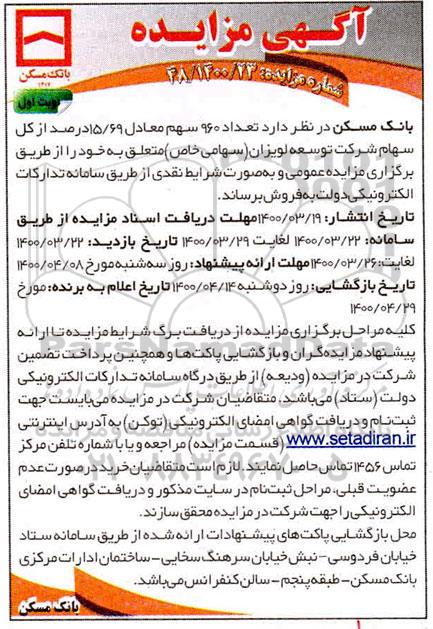 بانک مسکن در نظر دارد تعداد 960 سهم معادل 15.69 درصد از کل سهام شرکت توسعه لویزان (سهامی خاص) را از طریق برگزاری مزایده عمومی به صورت شرایط نقدی از طریق سامانه تدارکات الکترونیکی دولت به فروش برساند.