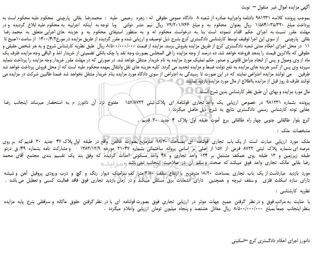 بموجب پرونده کلاسه 981231 دادنامه واجراییه صادره از شعبه 8 دادگاه عمومی حقوقی له : زهره رحیمی علیه : محمدرضا بقائی پارچینی محکوم علیه محکوم است به پرداخت مبلغ 1/584/035/320 ریال بعنوان محکوم به و مبلغ 79/201/766 ریال نیم عشر دولتی وبا توجه به اینکه اجراییه به محکوم علیه ابلاغ گردیده و در مهلت مقرر نسبت به اجرای حکم اقدام ننموده است بنا به درخواست محکوم له و به منظور استیفای محکوم به و هزینه های اجرایی متعلق به محمد رضا بقائی پارچینی از سوی این اجرا توقیف توسط کارشناسی دادگستری کرج بشرح ذیل توصیف و ارزیابی شده و مقرر گردیده از طریق مزایده در مورخ1400/4/2 از ساعت10صبح تا 11 در محل اجرای احکام مدنی شعبه دادگستری کرج از طریق مزایده بفروش برسد. مزایده از قیمت 8/500/000/000 ریال طبق نظریه کارشناس شروع و به هر شخص حقیقی و حقوقی که بالاترین قیمت را بدهد فروخته خواهد شد. ده درصد از وجه مزایده را فی المجلس بصورت وجه نقد یا چک بانکی تضمینی از خریدار اخذ و الباقی وجه مزایده ظرف یک ماه از وی وصول و پس از انجام مراحل قانونی و صدور حکم تملیک مورد مزایده به نام خریدار منتقل خواهد شد. در صورتی که در مهلت مقرر خریدار وجه مزایده را پرداخت ننماید سپرده وی پس از کسر هزینه های مزایده به نفع دولت ضبط و مزایده تجدید می گردد. کلیه هزینه های نقل وانتقال بعهده محکوم علیه است که از محل فروش پرداخت خواهد شد طرفین می توانند مزایده اعتراض نمایند که در این صورت تا رسیدگی به اعتراض از سوی دادگاه مورد مزایده بنام خریدار منتقل نخواهد شد ضمنا طالبین شرکت در مزایده می توانند ظرف 5 روز قبل از مزایده بااطلاع از مال مورد مزایده بازدید نمایند.