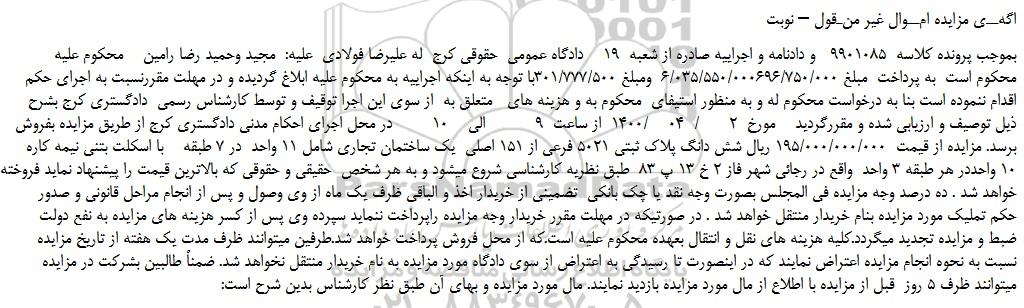 بموجب پرونده کلاسه  9901085   و دادنامه و اجراییه صادره از شعبه  19    دادگاه عمومی  حقوقی کرج  له علیرضا فولادی  علیه:  مجید وحمید رضا رامین    محکوم علیه محکوم است  به پرداخت  مبلغ 6/035/550/000696/750/000  ومبلغ 301/777/500با توجه به اینکه اجراییه به محکوم علیه ابلاغ گردیده و در مهلت مقررنسبت به اجرای حکم اقدام ننموده است بنا به درخواست محکوم له و به منظور استیفای  محکوم به و هزینه های   متعلق به  از سوی این اجرا توقیف و توسط کارشناس رسمی  دادگستری کرج بشرح ذیل توصیف و ارزیابی شده و مقررگردید    مورخ  2      /  04    /1400  از ساعت  9          الی    10        در محل اجرای احکام مدنی دادگستری کرج از طریق مزایده بفروش برسد. مزایده از قیمت  195/000/000/000 ریال شش دانگ پلاک ثبتی 5021 فرعی از 151 اصلی  یک ساختمان تجاری شامل 11 واحد  در 7 طبقه    با اسکلت بتنی نیمه کاره  10 واحددر هر طبقه 3 واحد  واقع در رجائی شهر فاز 2 خ 13 پ 83  طبق نظریه کارشناسی شروع میشود و به هر شخص  حقیقی و حقوقی که بالاترین قیمت را پیشنهاد نماید فروخته خواهد شد . ده درصد وجه مزایده فی المجلس بصورت وجه نقد یا چک بانکی  تضمینی از خریدار اخذ و الباقی ظرف یک ماه از وی وصول و پس از انجام مراحل قانونی و صدور حکم تملیک مورد مزایده بنام خریدار منتقل خواهد شد . در صورتیکه در مهلت مقرر خریدار وجه مزایده راپرداخت ننماید سپرده وی پس از کسر هزینه های مزایده به نفع دولت ضبط و مزایده تجدید میگردد.کلیه هزینه های نقل و انتقال بعهده محکوم علیه است.که از محل فروش پرداخت خواهد شد.طرفین میتوانند ظرف مدت یک هفته از تاریخ مزایده نسبت به نحوه انجام مزایده اعتراض نمایند که در اینصورت تا رسیدگی به اعتراض از سوی دادگاه مورد مزایده به نام خریدار منتقل نخواهد شد. ضمناً طالبین بشرکت در مزایده میتوانند ظرف 5 روز  قبل از مزایده با اطلاع از مال مورد مزایده بازدید نمایند. مال مورد مزایده و بهای آن طبق نظر کارشناس بدین شرح است: