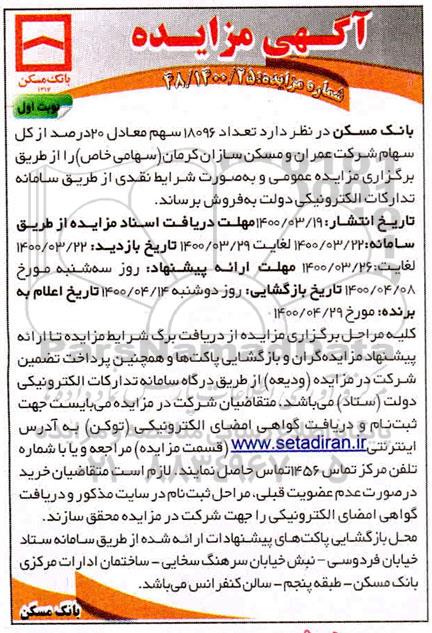 بانک مسکن در نظر دارد تعداد 18096 سهم معادل 20 درصد از کل سهام شرکت عمران و مسکن سازان کرمان (سهامی خاص) را از طریق برگزاری مزایده عمومی به صورت شرایط نقدی از طریق سامانه تدارکات الکترونیکی دولت به فروش برساند.