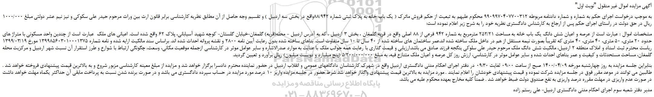 مشخصات اموال : عبارت است از عرصه و اعیان شش دانگ یک باب خانه به مساحت 252/21 مترمربع به شماره 942 فرعی از 88 اصلی واقع در قریه گلمغان ، بخش 3 اردبیل ، که به آدرس اردبیل - محله(قریه) گلمغان-خیابان گلستان- کوچه شهید آسیابانی، پلاک 62 واقع شده است. اعیانی های ملک  عبارت است از چندین واحد مسکونی با متراژ های حدود 20 متری، 50 متری، 40 متری، 40 متری که تقریباً بصورت نیمه مستقل از هم در داخل ملک ساخته شده اند.عمر ساختمان های ساخته شده از 40 سال تا 10 سال متفاوت است. بناهای ساخته شده بدون رعایت آیین نامه 2800 و نقشه پروانه احداث شده اند. براساس سند مالکیت ارایه شده و نامه شماره 139985603010001375 مورخ 1399/03/19 ریاست محترم ثبت اسناد و املاک منطقه 2 اردبیل، مالکیت شش دانگ ملک مرحوم حیدر علی سلوکی ینگجه فرزند صادق می باشد.ارزیابی و قیمت گذاری با رعایت همه جوانب ملک با عنایت به موارد صدرالاشاره و سایر عوامل موثر در کارشناسی ازجمله موقعیت مکانی، وسعت، چگونگی ارتباط با شوارع و طرز استقرار آن نسبت شهر اردبیل و مرکزیت محله گلمغان، مساحت مستحدثات و کیفیت و عمر بناهای احداث شده و سایر عوامل موثر در کارشناسی، ارزش روز کل عرصه و اعیان ملک متنازع فیه، به مبلغ 5/200/000/000 (پنج میلیارد و دویست میلیون) ریال برآورد و تعیین گردید.