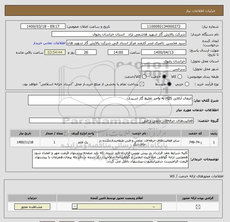نام دستگاه خریدار:شرکت پالایش گاز شهید هاشمی نژاد استان خراسان رضوی