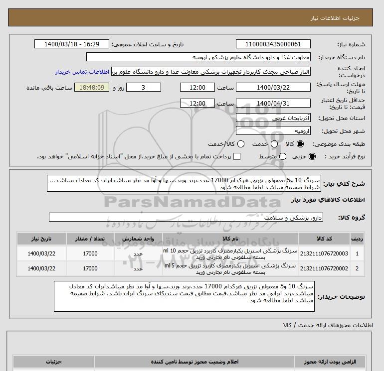 شرح کلی نیاز: سرنگ 10 و5 معمولی تزریق هرکدام 17000 عدد،برند ورید،سها و آوا مد نظر میباشدایران کد معادل میباشد،،، شرایط ضمیمه میباشد لطفا مطالعه شود