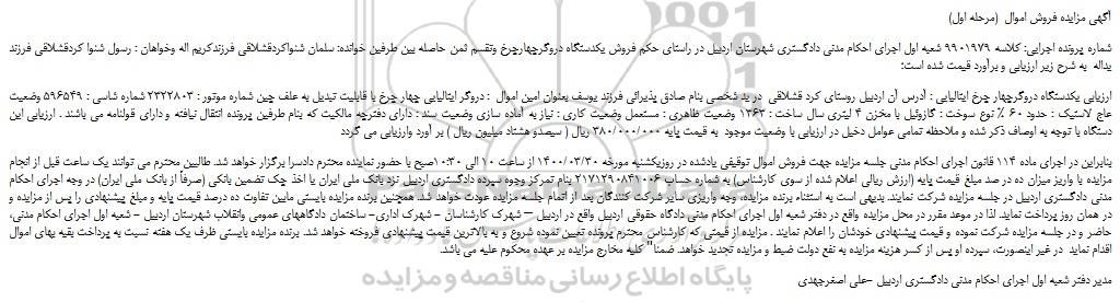 بنابراین در اجرای ماده 114 قانون اجرای احکام مدنی جلسه مزایده جهت فروش اموال توقیفی یادشده در روزیکشنبه مورخه 1400/03/30 از ساعت 10 الی 10:30صبح با حضور نماینده محترم دادسرا برگزار خواهد شد. طالبین محترم می توانند یک ساعت قبل از انجام مزایده با واریز میزان ده در صد مبلغ قیمت پایه (ارزش ریالی اعلام شده از سوی کارشناس) به شماره حساب 2171290841006 بنام تمرکز وجوه سپرده دادگستری اردبیل نزد بانک ملی ایران یا اخذ چک تضمین بانکی (صرفاً از بانک ملی ایران) در وجه اجرای احکام مدنی دادگستری اردبیل در جلسه مزایده شرکت نمایند. بدیهی است به استثناء برنده مزایده، وجه واریزی سایر شرکت کنندگان بعد از اتمام جلسه مزایده عودت خواهد شد. همچنین برنده مزایده بایستی مابین تفاوت ده درصد قیمت پایه و مبلغ پیشنهادی را پس از مزایده و در همان روز پرداخت نماید. لذا در موعد مقرر در محل مزایده واقع در دفتر شعبه اول اجرای احکام مدنی دادگاه حقوقی اردبیل واقع در اردبیل – شهرک کارشناسان - شهرک اداری- ساختمان دادگاههای عمومی وانقلاب شهرستان اردبیل - شعبه اول اجرای احکام مدنی، حاضر و در جلسه مزایده شرکت نموده و قیمت پیشنهادی خودشان را اعلام نمایند . مزایده از قیمتی که کارشناس محترم پرونده تعیین نموده شروع و به بالاترین قیمت پیشنهادی فروخته خواهد شد. برنده مزایده بایستی ظرف یک هفته نسبت به پرداخت بقیه بهای اموال اقدام نماید در غیر اینصورت، سپرده او پس از کسر هزینه مزایده به نفع دولت ضبط و مزایده تجدید خواهد. ضمنا" کلیه مخارج مزایده بر عهده محکوم علیه می باشد.