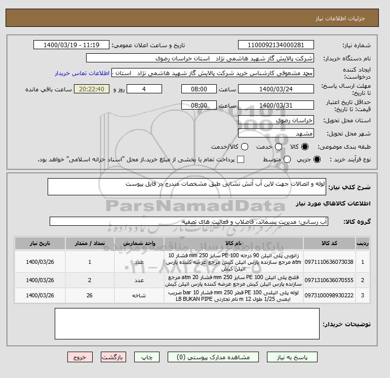 نام دستگاه خریدار:شرکت پالایش گاز شهید هاشمی نژاد استان خراسان رضوی
