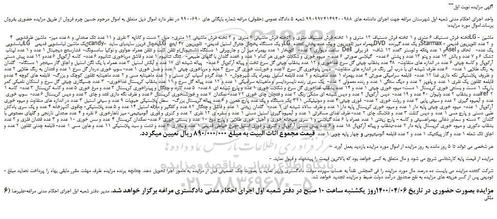 واحد اجرای احکام مدنی شعبه اول شهرستان مراغه جهت اجرای دادنامه های 9909974149400988 شعبه 5 دادگاه عمومی (حقوقی) مراغه شماره بایگانی های 9900690 در نظر دارد اموال ذیل متعلق به اموال مرحوم حسین چرم فروش از طریق مزایده حضوری بفروش برساند.اموال مورد مزایده: