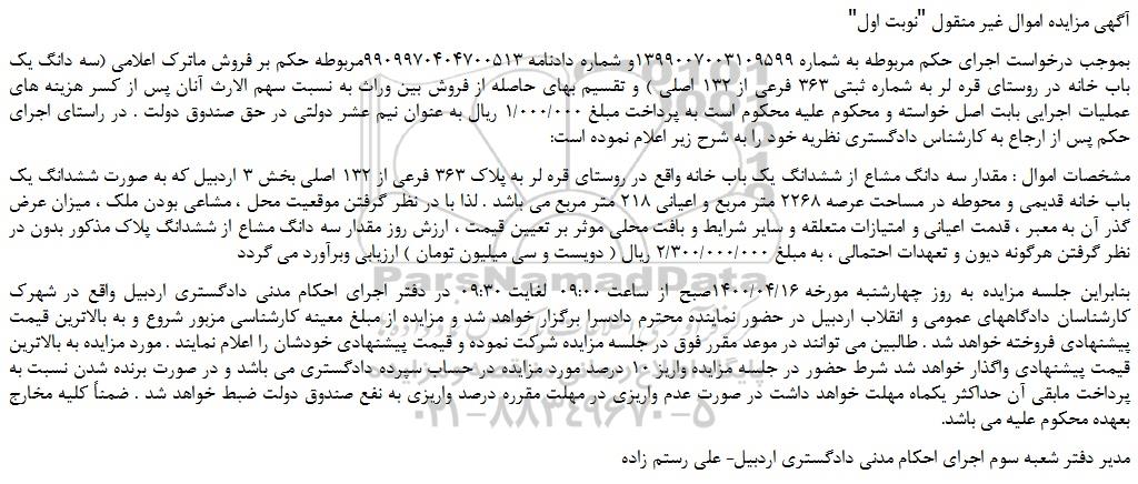 بموجب درخواست اجرای حکم مربوطه به شماره 1399007003109599و شماره دادنامه 9909970404700513مربوطه حکم بر فروش ماترک اعلامی (سه دانگ یک باب خانه در روستای قره لر به شماره ثبتی 363 فرعی از 132 اصلی ) و تقسیم بهای حاصله از فروش بین وراث به نسبت سهم الارث آنان پس از کسر هزینه های عملیات اجرایی بابت اصل خواسته و محکوم علیه محکوم است به پرداخت مبلغ 1/000/000 ریال به عنوان نیم عشر دولتی در حق صندوق دولت . در راستای اجرای حکم پس از ارجاع به کارشناس دادگستری نظریه خود را به شرح زیر اعلام نموده است: