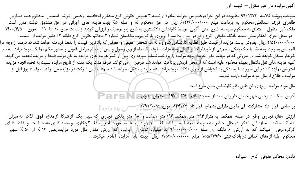 بموجب پرونده کلاسه 9901274 مطروحه در این اجرا درخصوص اجرائیه صادره از شعبه 3 عمومی حقوقی کرج محکوم له:فاطمه رحیمی فرزند اسمعیل محکوم علیه :سیاوش طاهری فرزند عبدالعلی محکوم به پرداخت مبلغ 6/226/000/000 ریال در حق محکوم له و مبلغ 5% بابت هزینه های اجرائی در حق صندوق دولت مقرر است ملک غیر منقول متعلق به محکوم علیه به شرح متن آگهی توسط کارشناس دادگستری به شرح زیر توصیف و ارزیابی گردید.از ساعت صبح 10 تا 11 مورخ 1400/4/5 در محل اجرای احکام مدنی شعبه دادگاه حقوقی کرج واقع در بلوار ملاصدرا روبروی پارک نبوت ساختمان شماره 2 محاکم حقوقی کرج طبقه 3 ازطیق مزایده از قیمت 2/520/000/000 ریال بفروش برسد. مزایده از قیمت طبق نظریه کارشناس شروع و به هر شخص حقیقی و حقوقی که بالاترین قیمت را بدهد فروخته خواهد شد. ده درصد از وجه مزایده را فی المجلس بصورت وجه نقد یا چک بانکی تضمینی از خریدار اخذ و الباقی وجه مزایده ظرف یک ماه از وی وصول و پس از انجام مراحل قانونی و صدور حکم تملیک مورد مزایده به نام خریدار منتقل خواهد شد. در صورتی که در مهلت مقرر خریدار وجه مزایده را پرداخت ننماید سپرده وی پس از کسر هزینه های مزایده به نفع دولت ضبط و مزایده تجدید می گردد. کلیه هزینه های نقل وانتقال بعهده محکوم علیه است که از محل فروش پرداخت خواهد شد طرفین می توانند ظرف مدت یک هفته از تاریخ مزایده نسبت به نحوه انجام مزایده اعتراض نمایند که در این صورت تا رسیدگی به اعتراض از سوی دادگاه مورد مزایده بنام خریدار منتقل نخواهد شد ضمنا طالبین شرکت در مزایده می توانند ظرف 5 روز قبل از مزایده بااطلاع از مال مورد مزایده بازدید نمایند.