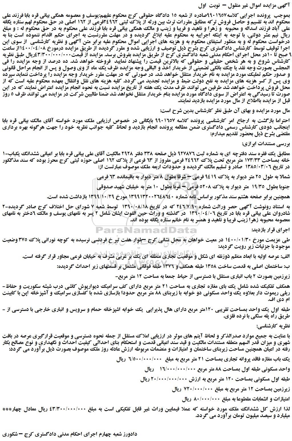بموجب پرونده اجرایی کلاسه9901657صادره از شعبه 15 دادگاه حقوقی کرج محکوم علیهم:یوسف و معصومه همگی بیانی قره بابا فرزند علی محکوم اند به تقسیم و حاصل فروش ترکه مطابق مقررات ترث بین ورثه از پلاک ثبتی 24962فرعی از 162 اصلی در حق محکوم لهم ستاره یگانه علی آباد فرزند اسداله و محبوبه و زهرا و ناهید و فریبا و زینب و مالک همگی بیانی قره بابا فرزند علی محکوم به در حق محکوم له : و مبلغ ریال نیم عشر دولتی. با توجه به اینکه اجراییه به محکوم علیه ابلاغ گردیده و در مهلت مقررنسبت به اجرای حکم اقدام ننموده است بنا به درخواست محکوم له و به منظور استیفای محکوم به و هزینه های اجرایی اموال محکوم علیه برابر متن آگهی و نظریه کارشناسی از سوی این اجرا توقیف توسط کارشناس دادگستری کرج بشرح ذیل توصیف و ارزیابی شده و مقرر گردیده از طریق مزایده درمورخ 1400/04/08از ساعت 9 صبح تا 10در محل اجرای احکام مدنی شعبه دادگستری کرج از طریق مزایده بفروش برسد. مزایده از قیمت43/300/000/000ریال طبق نظریه کارشناس شروع و به هر شخص حقیقی و حقوقی که بالاترین قیمت را پیشنهاد نمایید فروخته خواهد شد. ده درصد از وجه مزایده را فی المجلس بصورت وجه نقد یا چک بانکی تضمینی از خریدار اخذ و الباقی وجه مزایده ظرف یک ماه از وی وصول و پس از انجام مراحل قانونی و صدور حکم تملیک مورد مزایده به نام خریدار منتقل خواهد شد. در صورتی که در مهلت مقرر خریدار وجه مزایده را پرداخت ننماید سپرده وی پس از کسر هزینه های مزایده به نفع دولت ضبط و مزایده تجدید می گردد. کلیه هزینه های نقل وانتقال بعهده محکوم علیه است که از محل فروش پرداخت خواهد شد طرفین می توانند ظرف مدت یک هفته از تاریخ مزایده نسبت به نحوه انجام مزایده اعتراض نمایند که در این صورت تا رسیدگی به اعتراض از سوی دادگاه مورد مزایده بنام خریدار منتقل نخواهد شد ضمنا طالبین شرکت در مزایده می توانند ظرف 5 روز قبل از مزایده بااطلاع از مال مورد مزایده بازدید نمایند.