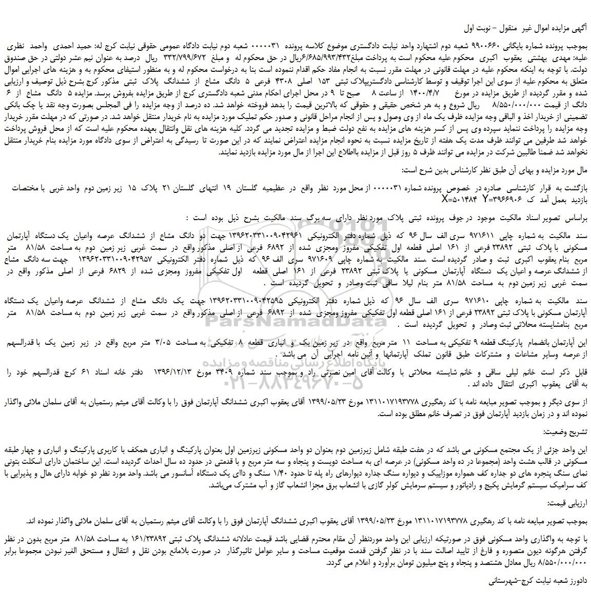 سند مالکیت به شماره چاپی 971611 سری الف سال 96 که ذیل شماره دفتر الکترونیکی 139620331009042961 جهت دو دانگ مشاع از ششدانگ عرصه واعیان یک دستگاه آپارتمان مسکونی با پلاک ثبتی 23892 فرعی از 161 اصلی قطعه اول تفکیکی مفروز ومجزی شده از 6892 فرعی از اصلی مذکور واقع در سمت غربی زیر زمین دوم به مساحت 81/58 متر مربع بنام یعقوب اکبری ثبت و صادر گردیده است .سند مالکیت به شماره چاپی 971609 سری الف 96 که ذیل شماره دفتر الکترونیکی 139620331009042957 جهت سه دانگ مشاع از ششدانگ عرصه و اعیان یک دستگاه آپارتمان مسکونی یا پلاک ثبتی 23892 فرعی از 161 اصلی قطعه اول تفکیکی مفروز ومجزی شده از 6829 فرعی از اصلی مذکور واقع در سمت غربی زیر زمین دوم به مساحت 81/58 متر بنام لیلا ساقی ثبت وصادر و تحویل گردیده است .