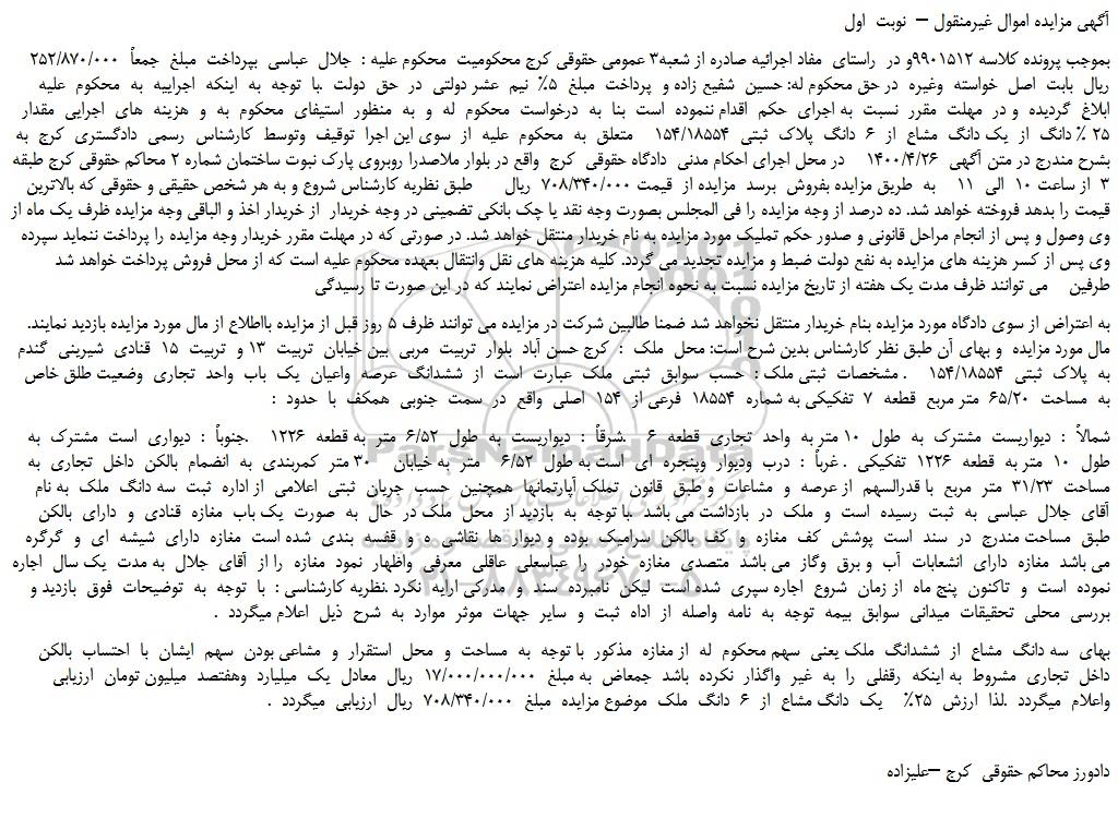 بموجب پرونده کلاسه 9901512و در  راستای  مفاد اجرائیه صادره از شعبه3 عمومی حقوقی کرج محکومیت  محکوم علیه :  جلال  عباسی  بپرداخت  مبلغ  جمعاً  252/870/000  ریال  بابت  اصل  خواسته  وغیره  در حق محکوم له: حسین  شفیع زاده و  پرداخت  مبلغ  5%  نیم  عشر دولتی  در  حق  دولت  .با  توجه  به  اینکه  اجراییه  به  محکوم  علیه  ابلاغ  گردیده  و در  مهلت  مقرر  نسبت  به اجرای  حکم  اقدام ننموده  است  بنا  به  درخواست  محکوم  له  و  به  منظور  استیفای  محکوم  به  و  هزینه  های  اجرایی  مقدار  25 % دانگ  از  یک دانگ  مشاع  از  6  دانگ  پلاک  ثبتی  154/18554    متعلق  به  محکوم  علیه  از  سوی این اجرا  توقیف  وتوسط  کارشناس  رسمی  دادگستری  کرج  به بشرح مندرج در متن آگهی  1400/4/26    در محل اجرای احکام مدنی  دادگاه حقوقی  کرج  واقع در بلوار ملاصدرا روبروی پارک نبوت ساختمان شماره 2 محاکم حقوقی کرج طبقه 3  از ساعت 10  الی  11    به  طریق مزایده بفروش  برسد  مزایده از  قیمت 708/340/000  ریال      طبق نظریه کارشناس شروع و به هر شخص حقیقی و حقوقی که بالاترین قیمت را بدهد فروخته خواهد شد. ده درصد از وجه مزایده را فی المجلس بصورت وجه نقد یا چک بانکی تضمینی در وجه خریدار  از خریدار اخذ و الباقی وجه مزایده ظرف یک ماه از وی وصول و پس از انجام مراحل قانونی و صدور حکم تملیک مورد مزایده به نام خریدار منتقل خواهد شد. در صورتی که در مهلت مقرر خریدار وجه مزایده را پرداخت ننماید سپرده وی پس از کسر هزینه های مزایده به نفع دولت ضبط و مزایده تجدید می گردد. کلیه هزینه های نقل وانتقال بعهده محکوم علیه است که از محل فروش پرداخت خواهد شد طرفین    می توانند ظرف مدت یک هفته از تاریخ مزایده نسبت به نحوه انجام مزایده اعتراض نمایند که در این صورت تا رسیدگی