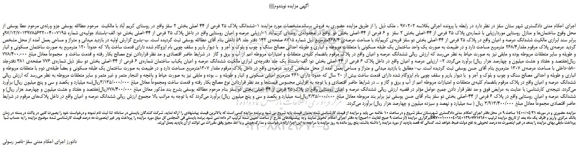 اجرای احکام مدنی دادگستری شهر ستان سقز در نظر دارد در رابطه با پرونده اجرائی بکلاسه 970202 ، ملک ذیل را از طریق مزایده حضوری به فروش برساند.مشخصات مورد مزایده: 1-ششدانگ پلاک 25 فرعی از 44 اصلی بخش 2 سقز واقع در روستای کریم آباد با مالکیت مرحوم عطاالله یوسفی جزو ورثه ی مرحوم عطا یوسفی از محل وقوع ساختمان ها و منازل روستایی موردارزیابی با شماره ی پلاک 25 فرعی از 44-اصلی بخش 2 سقز و 6 فرعی از 44-اصلی بخش دو واقع در محدوده ی روستای کریم آباد 1-ارزیابی عرصه و اعیان روستایی واقع در داخل پلاک 25 فرعی از 44-اصلی بخش دو: الف-باستناد جوابیه ی شماره 139785632004007195-97/12/7و برابر سند ابرازی مالکیت ششدانگ عرصه و اعیان واقع در پلاک 25 فرعی از 44-اصلی بخش دو سقز قریه ی کریم آباد با مساحت عرصه ی 268/4مترمربع ذیل شماره 8715 صفحه ی 142 دفتر جلد 59 داخلی بنام آقای عطاالله یوسفی ثبت گردیده است. ب-بشرح گزارش اولیه در بازدید میدانی و متراژ و مساحی بعمل آمده از محل مشخص گردید عرصه ی پلاک مرقوم مقدار268/4 مترمربع مساحت دارد و در طبیعت به صورت یک واحد ساختمان یک طبقه مسکونی با متعلقات مربوطه و انباری و طویله احداثی مصالح سنگ و چوب و بلوک و آجر و با دیوار باربر و سقف چوبی بام ایزوگام شده دارای قدمت ساخت بالا که حدوداً 120 مترمربع به صورت ساختمان مسکونی و انبار و طویله و سایر متعلقات مربوطه بوده و مابقی نیز به صورت حیاط به نظر می رسد که ارزش ریالی ششدانگ عرصه و اعیان واقع در پلاک مرقوم بانضمام کلیه ی متعلقات و امتیازات مربوطه اعم از آب و برق و گاز در شرایط حاضر اقتصادی و مد نظر قراردادن نوع مصالح بکار رفته و قدمت ساخت و مجموعاً معادل مبلغ 778/400.000 ریال(هفتصد و هفتاد و هشت میلیون و چهارصد هزار ریال) برآورد می گردد. 2- ارزیابی عرصه و اعیان واقع در داخل پلاک 6 فرعی از 44-اصلی بخش دو: الف-باستناد یک جلد دفترچه ی ابرازی مالکیت ششدانگ عرصه و اعیان یکباب ساختمان شماره ی 6 فرعی از 44-اصلی بخش دو سقز ذیل شماره ی 776 صفحه ی 381 دفترجلد -58-داخلی با مساحت عرصه ی 1307 مترمربع بنام آقای حسن یوسفی ثبت گردیده است. ب- مطابق با بازدید میدانی و متراژ و مساحی بعمل آمده از محل مشخص گردید عرصه ی واقع در داخل پلاک مرقوم مقدار 1307مترمربع مساحت دارد و در طبیعت به صورت ساختمان یک طبقه مسکونی و بعضاً طبقه ی دوم با متعلقات مربوطه و انباری و طویله و احداثی مصالح سنگ و چوب و بلوک و آجر و با دیوار باربر و سقف چوبی بام ایزوگام شده دارای قدمت ساخت بیش از 20 سال که حدوداً دارای 361 مترمربع اعیانی مسکونی و انبار و طویله و ... بوده و مابقی نیز به صورت حیاط و باغچه و اشجار مثمر و غیر مثمر و سایر متعلقات مربوطه به نظر می رسد که ارزش ریالی ششدانگ عرصه و اعیان واقع در پلاک مرقوم بانضمام کلیه ی متعلقات و امتیازات مربوطه اعم از آب و برق و گاز و ... در شرایط حاضر اقتصادی و با توجه به افزایش محسوس قیمت ها و مد نظر قراردادن نوع مصالح بکار رفته و قدمت ساخت ومجموعاً معادل مبلغ 3/135/000/000ریال(سه میلیارد و یکصد و سی و پنج میلیون ریال) برآورد می گردد. نتیجه ی کارشناسی: با عنایت به عرایض فوق و مد نظر قرار دادن جمیع عوامل مؤثر در قضیه ارزش ریالی ششدانگ عرصه و اعیان روستایی واقع در پلاک 25 فرعی از 44-اصلی بخش دو سقز بنام مرحوم عطاالله یوسفی بشرح بند مذکور معادل مبلغ 778/400/000ریال(هفتصد و هفتاد و هشت میلیون و چهارصد هزار ریال) و ششدانگ عرصه و اعیان روستایی واقع در پلاک 6 فرعی از 44-اصلی بخش دو سقز بنام آقای حسن یوسفی نیز برابر بند مربوطه معادل مبلغ 3/35/000/000ریال(سه میلیارد و یکصد و سی و پنج میلیون ریال) برآورد می گردد که با توجه به مراتب بالا مجموع ارزش ریالی ششدانگ عرصه و اعیان واقع در داخل پلاک های مرقوم در شرایط حاضر اقتصادی مجموعاً معادل مبلغ 3/913/400/000 ریال ( سه میلیارد و نهصد و سیزده میلیون و چهارصد هزار ریال) برآورد می گردد.