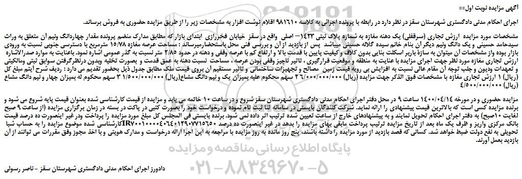 مشخصات مورد مزایده ارزش تجاری (سرقفلی) یک دهنه مغازه به شماره پلاک ثبتی 1423– اصلی واقع در سقز خیابان فخررازی ابتدای بازار که مطابق مدارک منضم پرونده مقدار چهاردانگ ونیم آن متعلق به وراث سیدحامد حسینی و یک دانگ ونیم دیگر آن بنام خانم سیده گلاله حسینی میباشد پس از بازدید از آن و بررسی فنی محل باستحضارمیرساند : مساحت عرصه مغازه 15/78 مترمربع با دسترسی جنوبی نسبت به ورودی بازار بوده واز مشخصات آن میتوان به سازۀ باربر اسکلت بنایی بدون کلاف و کیفیت پایین با قدمت بالا و ارتفاع کم با عرصه وقفی و دهنه در حدود 2/85 متر نسبت به گذر عمومی اشاره نمود. باعنایت به موارد صدرالاشاره ارزش تجاری مغازه مورد نظر جهت اجرای مزایده با عنایت به منطقه و موقعیت قرارگیری ، تاثیر ناچیز وقفی بودن عرصه ، مساحت نسبت دهنه به عمق قدمت و بصورت تخلیه وبدون درنظرگرفتن سوابق ثبتی ومالکیتی و تعهدات ودیون و جلب توجه آن مقام عالی نسبت به افزایش بی رویه قیمت زمین مصالح و تجهیزات ساختمانی و تاثیر مستقیم آن بروی قیمت ملک مطابق جدول ذیل بحضور تقدیم می دارد : ردیف شرح آیتم مبلغ کل (ریال) 1 ارزش تجاری مغازه با مشخصات فوق الذکر جهت مزایده (ریال) 6/000/000/000 2 سهم محکوم علیه بمیزان یک و نیم دانگ مشاع(ریال) 1/500/000/000 3 سهم محکوم له بمیزان چهار و نیم دانگ مشاع (ریال) 4/500/000/000