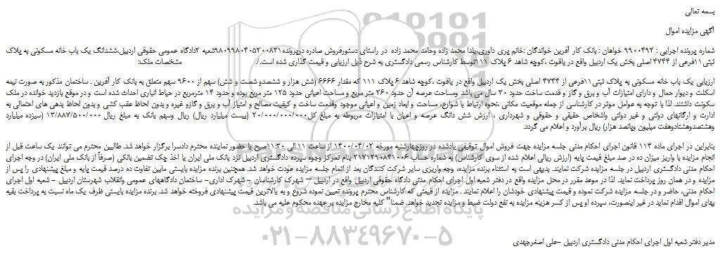 شعبه صادر کننده:شعبه اول اجرای احکام مدنی دادگستری شهرستان اردبیل/قدیم