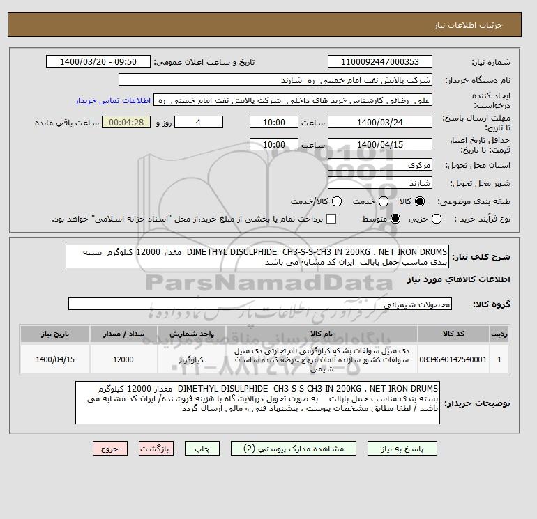 شرح کلی نیاز: DIMETHYL DISULPHIDE CH3-S-S-CH3 IN 200KG . NET IRON DRUMS مقدار 12000 کیلوگرم بسته بندی مناسب حمل باپالت ایران کد مشابه می باشد