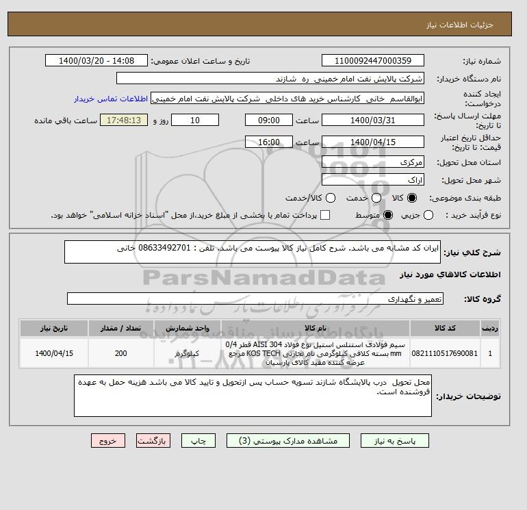 شرح کلی نیاز: ایران کد مشابه می باشد. شرح کامل نیاز کالا پیوست می باشد. تلفن : 08633492701 خانی
