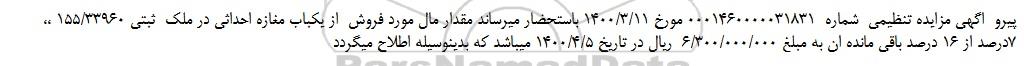 پیرو  اگهی مزایده تنظیمی  شماره  0001460000031831 مورخ 1400/3/11 باستحضار میرساند مقدار مال مورد فروش  از یکباب مغازه احداثی در ملک  ثبتی 155/33960 ،، 7درصد از 16 درصد باقی مانده ان به مبلغ 6/300/000/000  ریال در تاریخ 1400/4/5 میباشد که بدینوسیله اطلاح میگردد