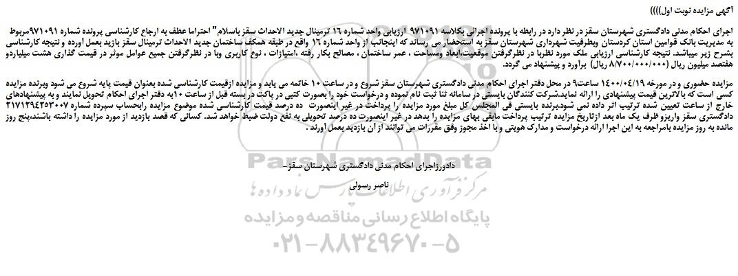 اجرای احکام مدنی دادگستری شهرستان سقز در نظر دارد در رابطه با پرونده اجرائی بکلاسه 971091 ارزیابی واحد شماره 16 ترمینال جدید الاحداث سقز باسلام" احتراما عطف به ارجاع کارشناسی پرونده شماره 971091مربوط به مدیریت بانک قوامین استان کردستان وبطرفیت شهرداری شهرستان سقز به استحضار می رساند که اینجانب از واحد شماره 16 واقع در طبقه همکف ساختمان جدید الاحداث ترمینال سقز بازید بعمل آورده و نتیجه کارشناسی بشرح زیر میباشد. نتیجه کارشناسی ارزیابی ملک مورد نظربا در نظرگرفتن موقعیت،ابعاد ومساحت ، عمر ساختمان ، مصالح بکار رفته ،امتیازات ، نوع کاربری وبا در نظرگرفتن جمیع عوامل موثر در قیمت گذاری هشت میلیاردو هفتصد میلیون ریال (8/700/000/000 ریال) برآورد و پیشنهاد می گردد.