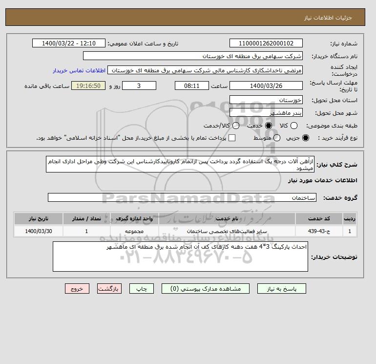 توضیحات خریدار:احداث پارکینگ 3*4 هفت دهنه کارهای کف آن انجام شده برق منطقه ای ماهشهر