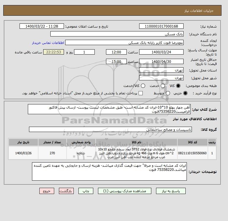 شرح کلی نیاز: آهن چهار پهلو 10*10-ایران کد مشابه است- طبق مشخصات لیست پیوست- ارسال پیش فاکتور الزامیست75358220فتوت