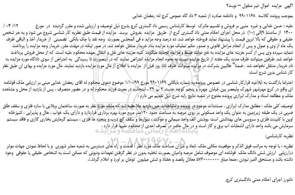 علیه : حسن خدایی و غیره منبی بر فروش و تقسیم ماترک توسط کارشناس رسمی داد گستری کرج بشرح ذیل توصیف و ارزیابی شده و مقرر گردیده در مورخ 12/ 04 / 1400 از ساعت( 9)الی (10) در محل اجرای احکام مدنی داد گستری کرج از طریق مزایده بفروش برسد. مزایده از قیمت طبق نظریه کار شناسی شروع می شود و به هر شخص حقیقی و حقوقی که بالا ترین قیمت را پیشنهاد نماید فروخته خواهد شد. ده درصد وجه مزاید ه فی المجلس بصورت وجه نقد یا چک بانکی تضمینی از خریدار اخذ و الباقی ظرف یک ماه از وی و صول و پس از انجام مراحل قانونی و صدور حکم تملیک مورد مزایده بنام خریدار منتقل خواهد شد. در صور تیکه در مهلت مقرر خریدار وجه مزایده را پرداخت ننماید سپرده وی پس از کسر هزینه های مزایده به نفع دولت ضبط و مزایده تجدید میگردد. کلیه هزینه های نقل و انتقال بعهده محکوم علیه است. که از محل فروش پرداخت خواهد شد. طرفین میتوانند ظرف مدت یک هفته از تاریخ مزایده نسبت به نحوه انجام مزایده اعتراض نمایند که در اینصورت تا رسیدگی به اعتراض از سوی دادگاه مورد مزایده به نام خریدار منتقل نخواهد شد . ضمنا" طالبین بشرکت در مزایده میتوانند ظرف (5) روز قبل از مزایده با اطلاع از مال مورد مزایده بازدید نمایند. مال مورد مزایده و بهای ان طبق نظر کار شناس بدین شرح است: