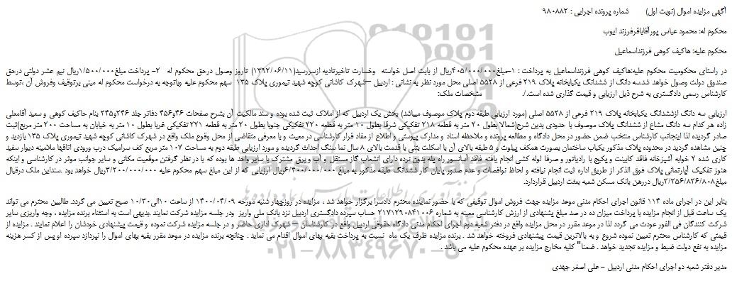 آگهی مزایده اموال (نوبت اول)        شماره پرونده اجرایی : 980882