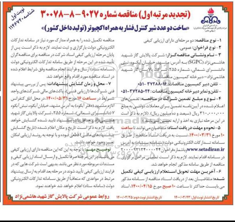 مناقصه ساخت دو عدد شیر کنترل فشار به همراه اکچیوتر تجدید, مناقصه ساخت دو عدد شیر کنترل فشار به همراه اکچیوتر تجدید