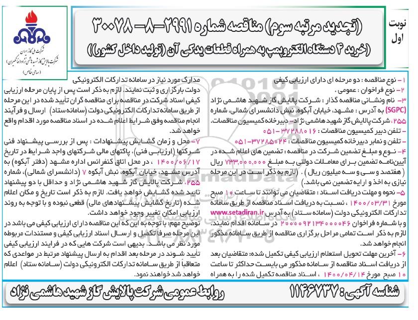 تجدید مناقصه خرید 4 دستگاه الکتروپمپ - مرتبه سوم از کلیه افراد متخصص و شرکتها واجد شرایط دعوت به عمل میآید در مناقصه با کد خبرگزاری پارس نماد: 3496254 شرکت نمایند.
