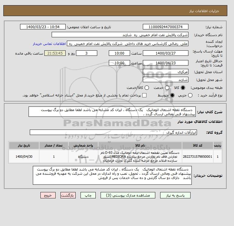 شرح کلی نیاز: دستگاه نقطه اشتعال اتوماتیک یک دستگاه . ایران کد مشابه می باشد لطفا مطابق دو برگ پیوست پیشنهاد فنی ومالی ارسال گردد .
