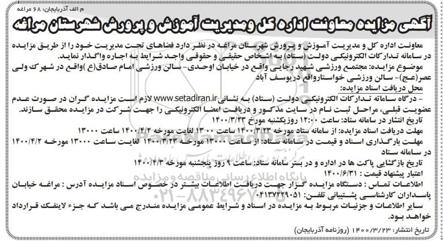 معاونت اداره کل و مدیریت آموزش و پرورش شهرستان مراغه در نظر دارد فضاهای تحت مدیریت خود را طریق مزایده و سامانه تدارکات الکترونیکی دولت ستاد به اشخاص حقیقی و حقوقی واجد شرایط به اجاره واگذار نماید