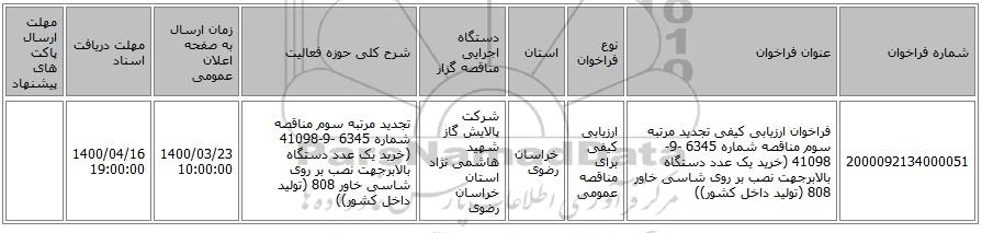 | 2000092134000051 | فراخوان ارزیابی کیفی تجدید مرتبه سوم مناقصه شماره 6345 -9-41098 (خرید یک عدد دستگاه بالابرجهت نصب بر روی شاسی خاور 808 (تولید داخل کشور)) | ارزیابی کیفی برای مناقصه عمومی | خراسان رضوی | شرکت پالایش گاز شهید هاشمی نژاد استان خراسان رضوی | تجدید مرتبه سوم مناقصه شماره 6345 -9-41098 (خرید یک عدد دستگاه بالابرجهت نصب بر روی شاسی خاور 808 (تولید داخل کشور)) | 1400/03/23 10:00:00 | 1400/04/16 19:00:00 |