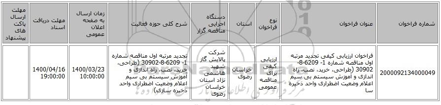 | 2000092134000049 | فراخوان ارزیابی کیفی تجدید مرتبه اول مناقصه شماره 1- 6209-8-30902 (طراحی، خرید، نصب، راه اندازی و آموزش سیستم بی سیم اعلام وضعیت اضطراری واحد ذخیره سا | ارزیابی کیفی برای مناقصه عمومی | خراسان رضوی | شرکت پالایش گاز شهید هاشمی نژاد استان خراسان رضوی | تجدید مرتبه اول مناقصه شماره 1- 6209-8-30902 (طراحی، خرید، نصب، راه اندازی و آموزش سیستم بی سیم اعلام وضعیت اضطراری واحد ذخیره سازی) | 1400/03/23 10:00:00 | 1400/04/16 19:00:00 |