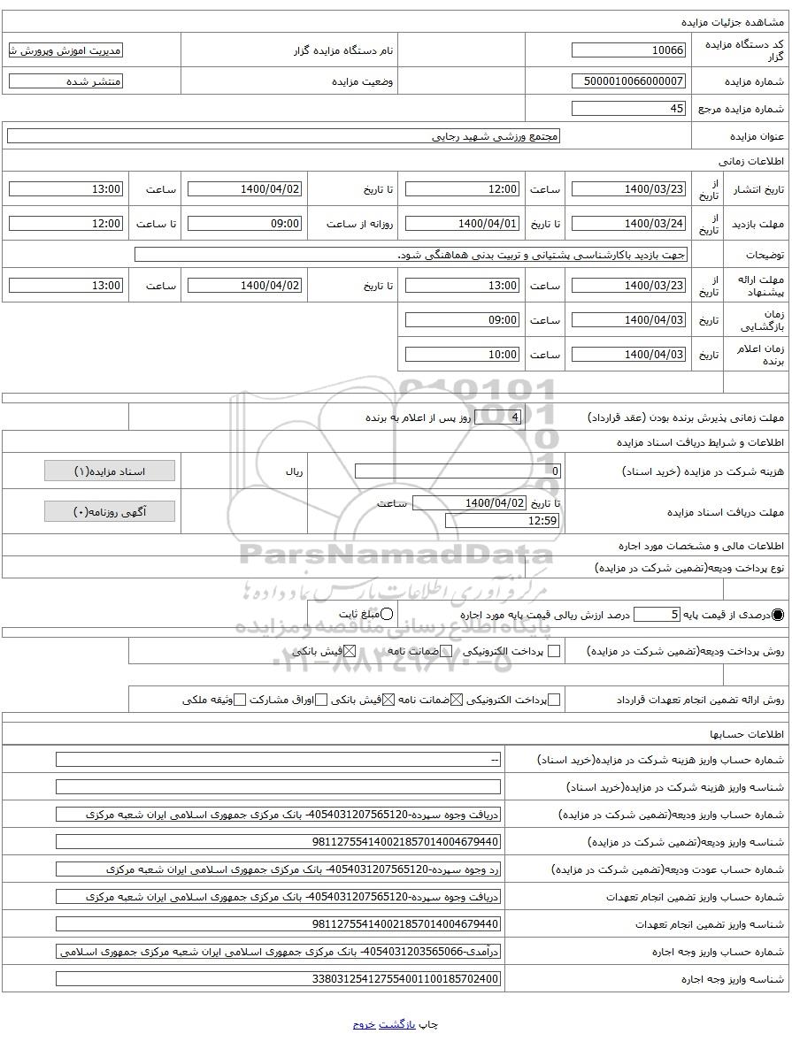 عنوان مزایدهمجتمع ورزشی شهید رجایی